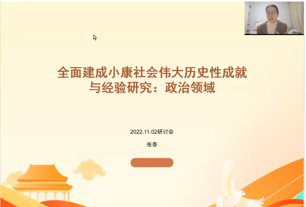 11月2日晚上,教育部哲学社会科学研究重大课题攻关项目“全面建成小康社会伟大历史性成就与经验研究”政治子课题组召开线上工作会议。本次会议由张天舒教授召集,来自马克思主义学院的青年教师张泰、靳贺、何淼、宋美桦作为子课题组核心成员参加会议。与会成员主要对“政治领域”初稿内容尤其是“国家治理现代化”模块进行了长达两个小时的专题研讨。