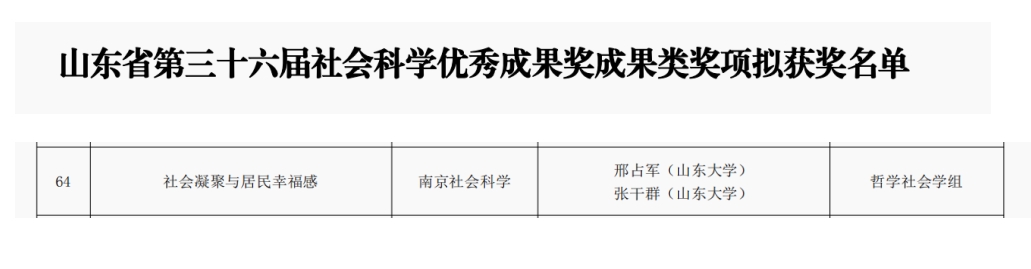 山东省社会科学优秀成果奖是山东省人民政府颁发的省级奖项,每两年评选一次。《社会凝聚与居民幸福感》发表于《南京社会科学》2019年第7期,第52-60页,《中国社会科学文摘》2020年第1期主体转载。