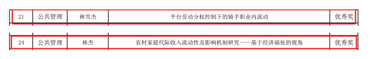 近日,山东大学政治学与公共管理学院举办了第二届博士生学术论文征文评审会暨论文写作提升研讨会,受邀专家分为政治学组和公共管理组对62篇学术论文进行封闭评审。中心博士研究生林杰的《农村家庭代际收入流动性及影响机制研究——基于经济福祉的视角》与林雪杰的《平台劳动分权控制下的骑手职业内流动》共同荣获优秀奖。