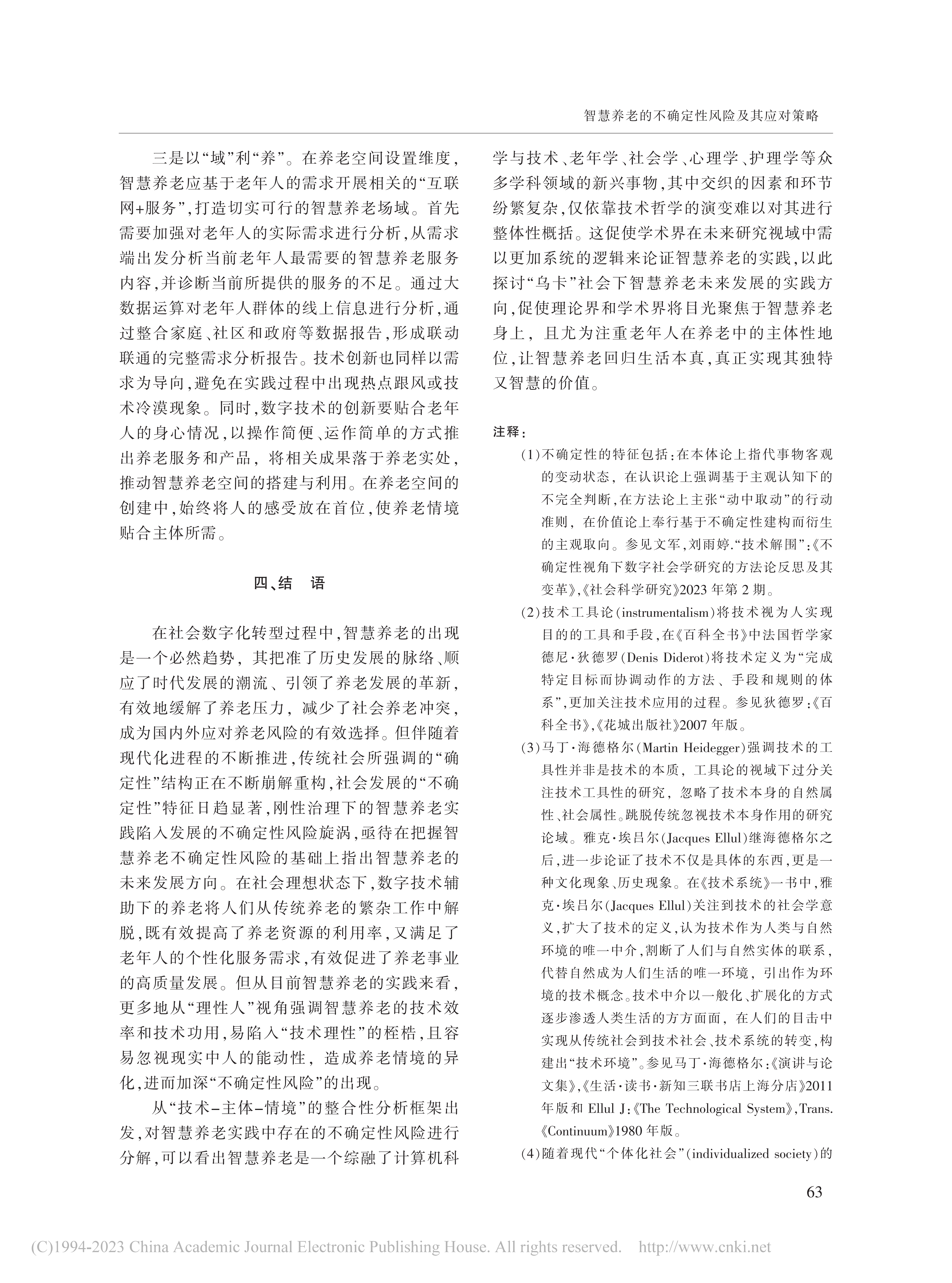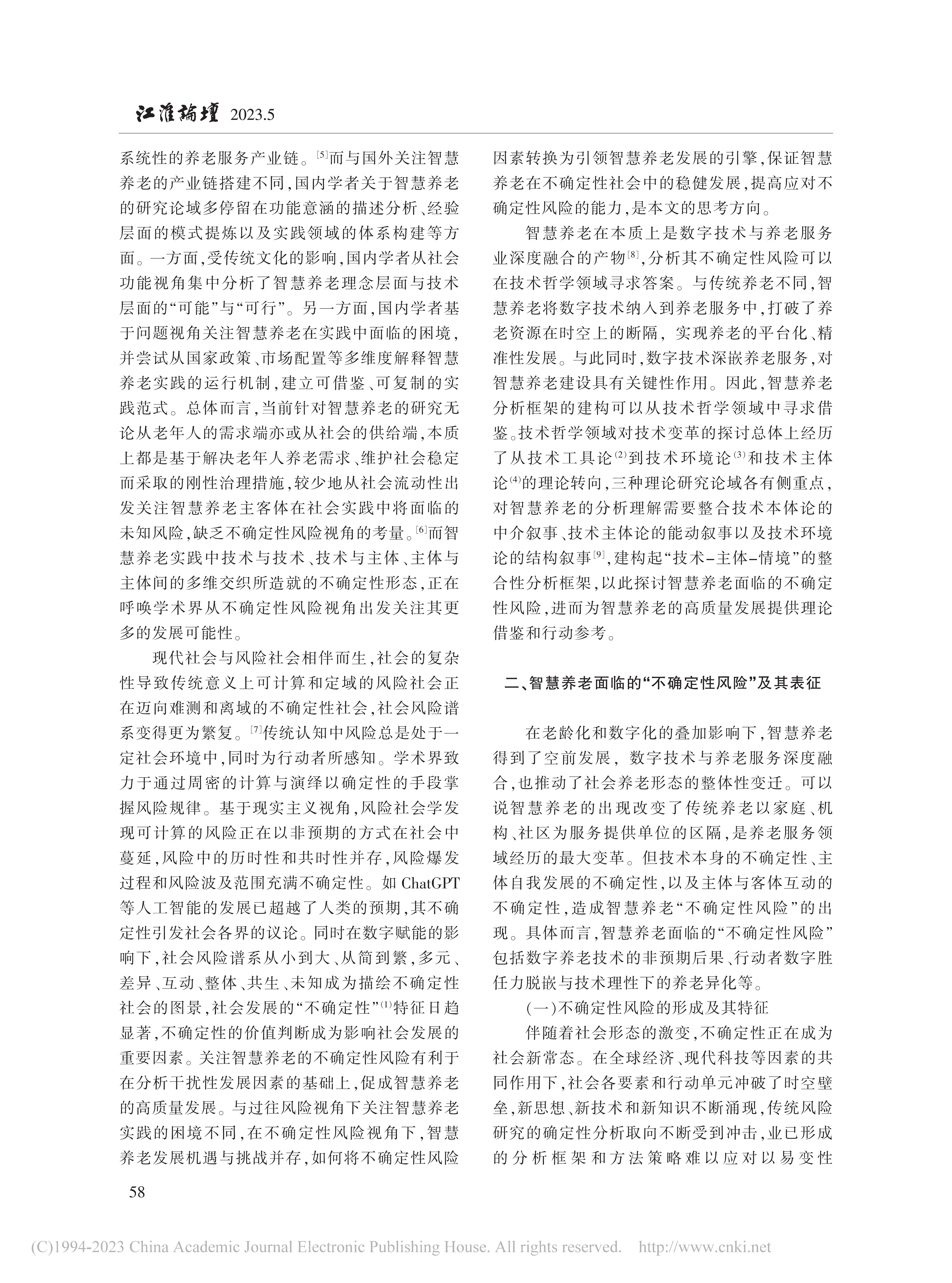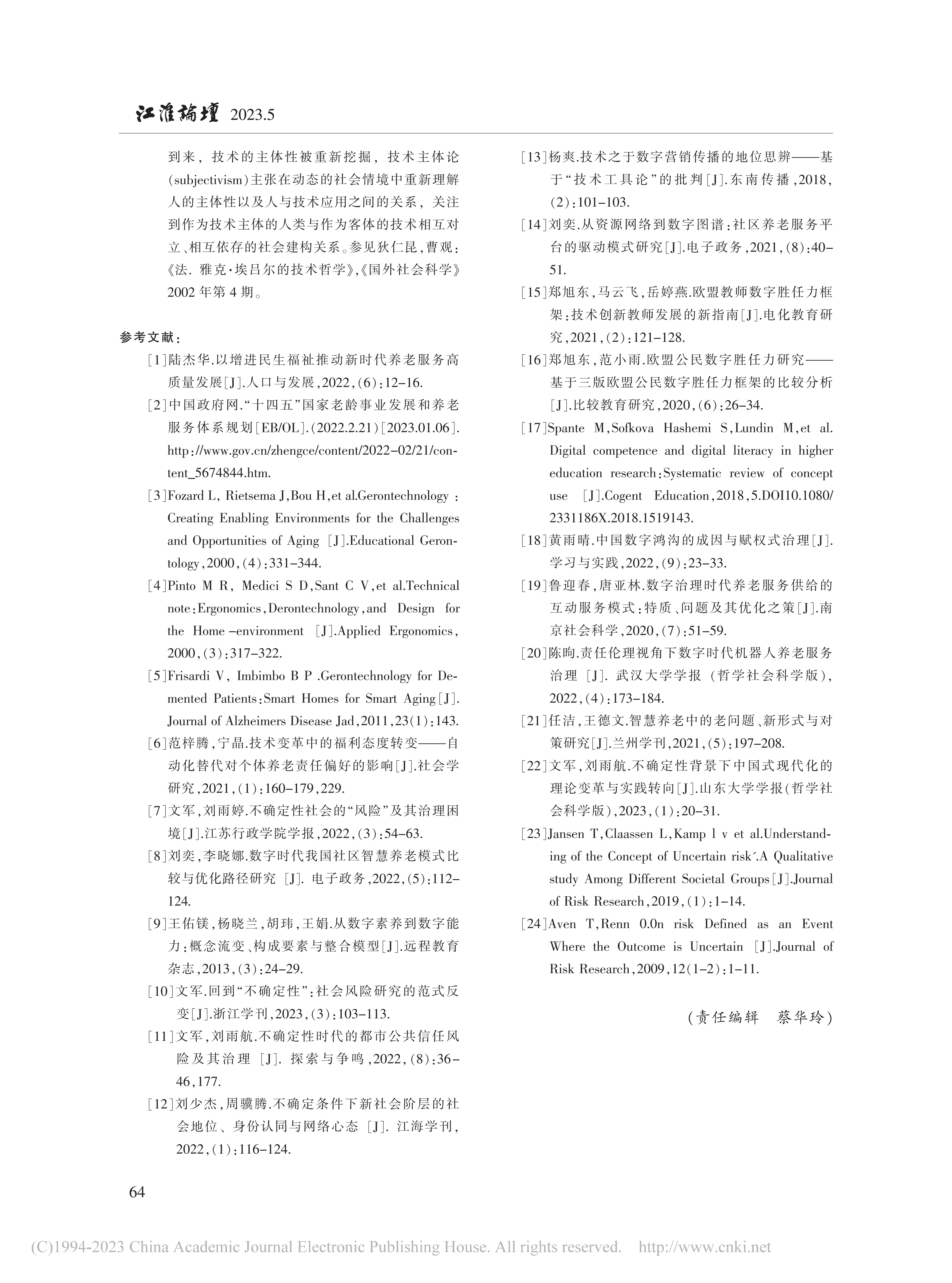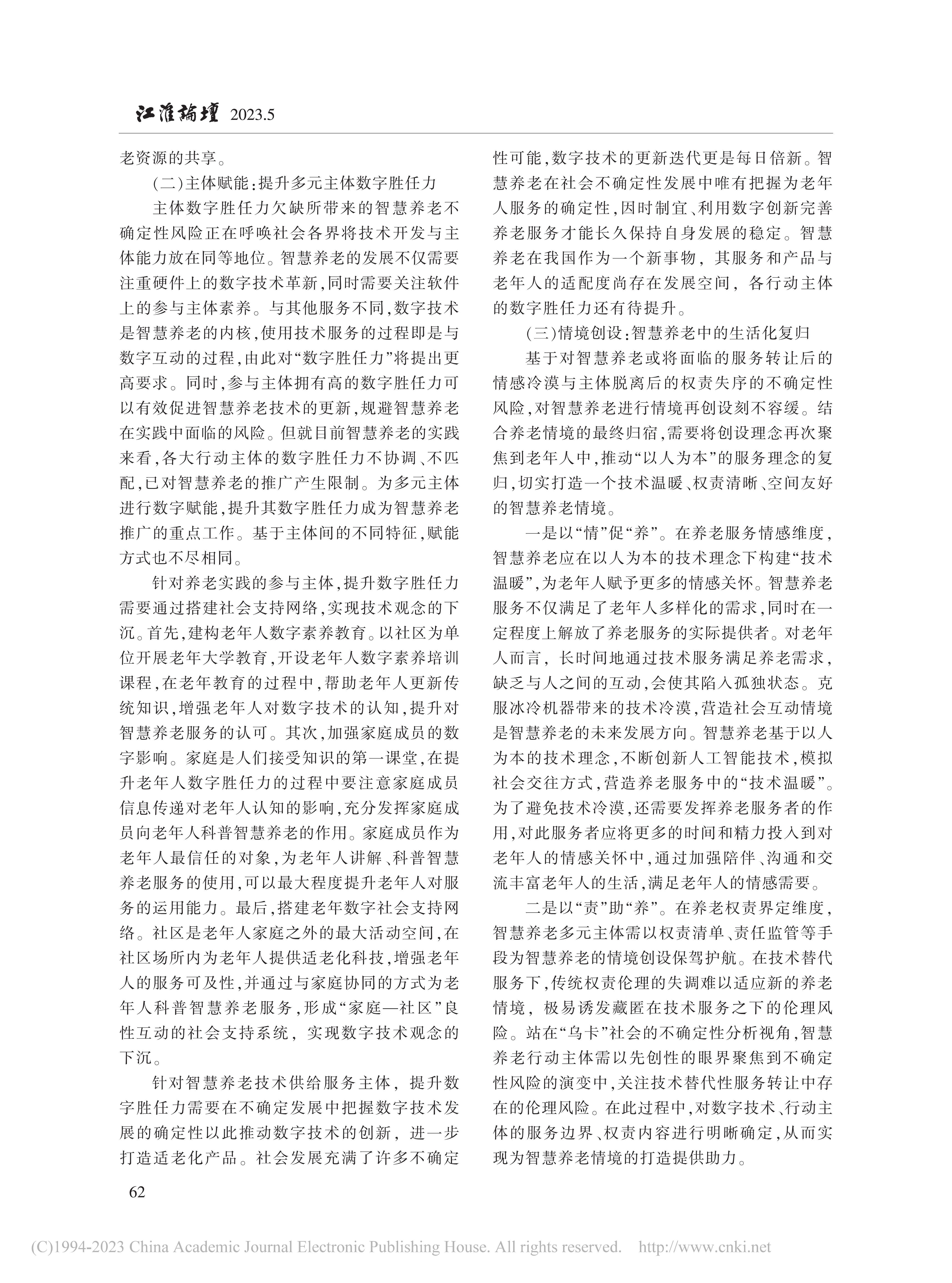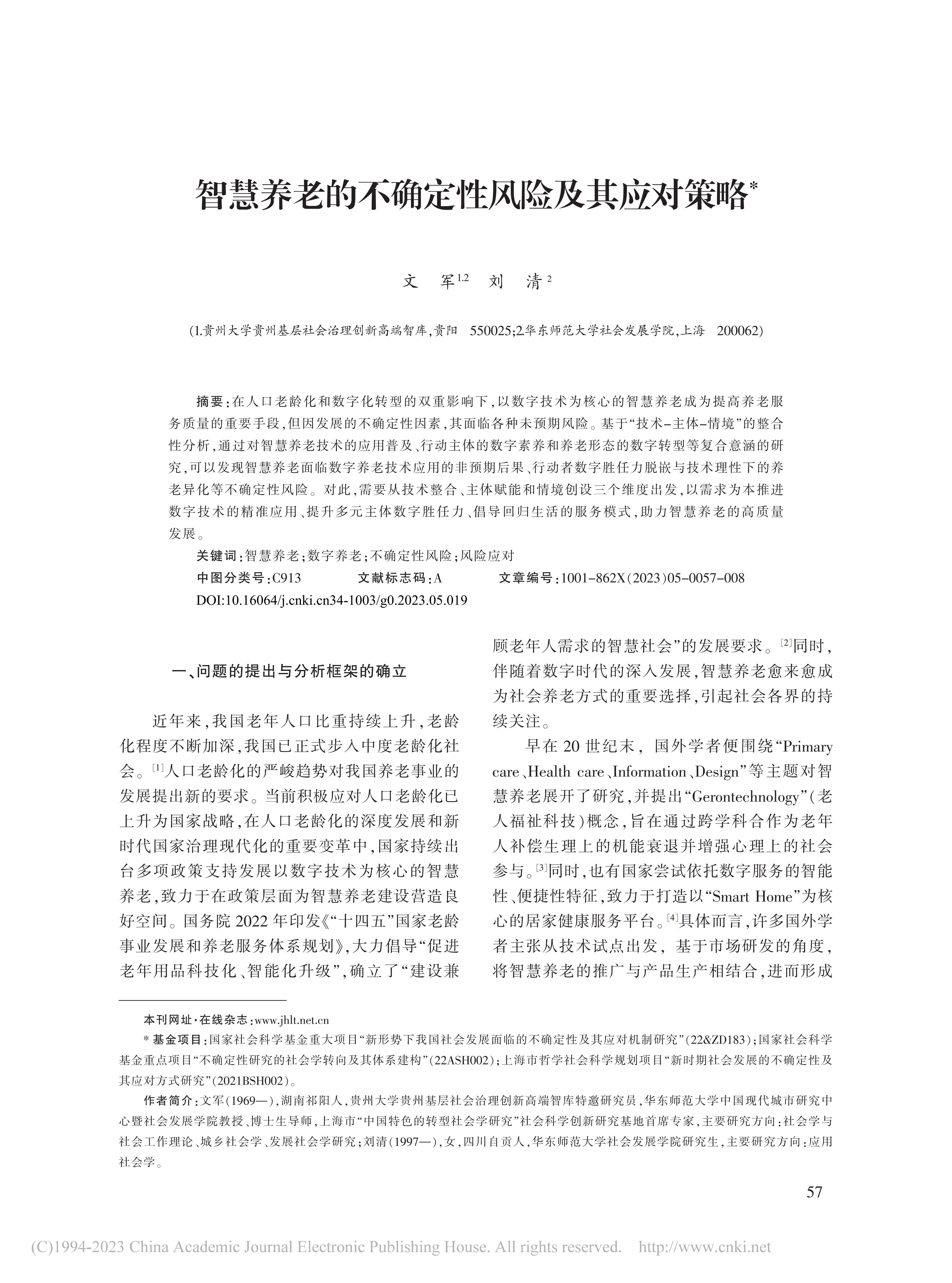 近日,中心特邀研究员文军教授与华东师范大学社会发展学院研究生刘清共同发表的载于《江淮论坛》2023年第5期文章《智慧养老的不确定性风险及其应对策略》被《新华文摘》2024年第4期全文转载。文章通过分析指出智慧养老面临数字养老技术应用的非预期后果、行动者数字胜任力脱嵌与技术理性下的养老异化等不确定性风险。破解这些风险需要从技术整合、主体赋能和情境创设三个维度出发,以需求为本推进数字技术的精准应用、提升多元主体数字胜任力、倡导回归生活的服务模式。本研究为智慧养老的高质量发展提供了理论借鉴与行动参考,对于推进我国养老事业的发展具有重要意义。