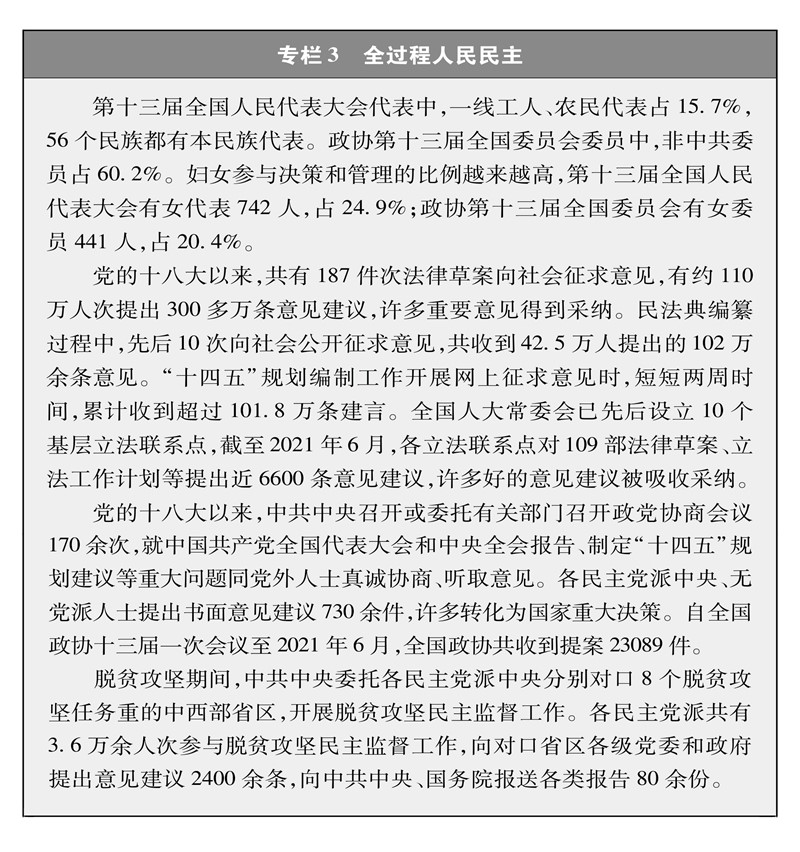 人民享有广泛民主权利。在中国,国家一切权力属于人民。人民依法实行民主选举、民主协商、民主决策、民主管理、民主监督(专栏3)。在中国,年满18周岁、具有中华人民共和国国籍、依法享有政治权利的公民,都有选举权和被选举权。坚持普遍、平等、直接选举和间接选举相结合以及差额选举、无记名投票的原则,依法保障人人享有平等的选举权利。社会主义协商民主广泛多层制度化发展,人民通过各种途径、渠道、方式,就改革发展稳定重大问题,特别是事关人民切身利益的问题广泛协商,找到全社会意愿和要求的最大公约数。党和国家制定实施重大决策,广泛征求和听取各方面意见,最大限度吸纳民意、汇集民智、凝聚民力,努力实现决策科学化民主化。人民广泛、直接参与社会事务管理,实现自我管理、自我服务、自我教育、自我监督。人民依照宪法和法律规定,有权对国家机关和国家工作人员提出批评和建议,有权对国家机关和国家工作人员的违法失职行为提出申诉、控告或者检举。民主选举、民主协商、民主决策、民主管理、民主监督各个环节环环相扣、彼此贯通,实现过程民主和结果民主、形式民主和实质民主、直接民主和间接民主相统一,保障了人民的知情权、参与权、表达权、监督权。